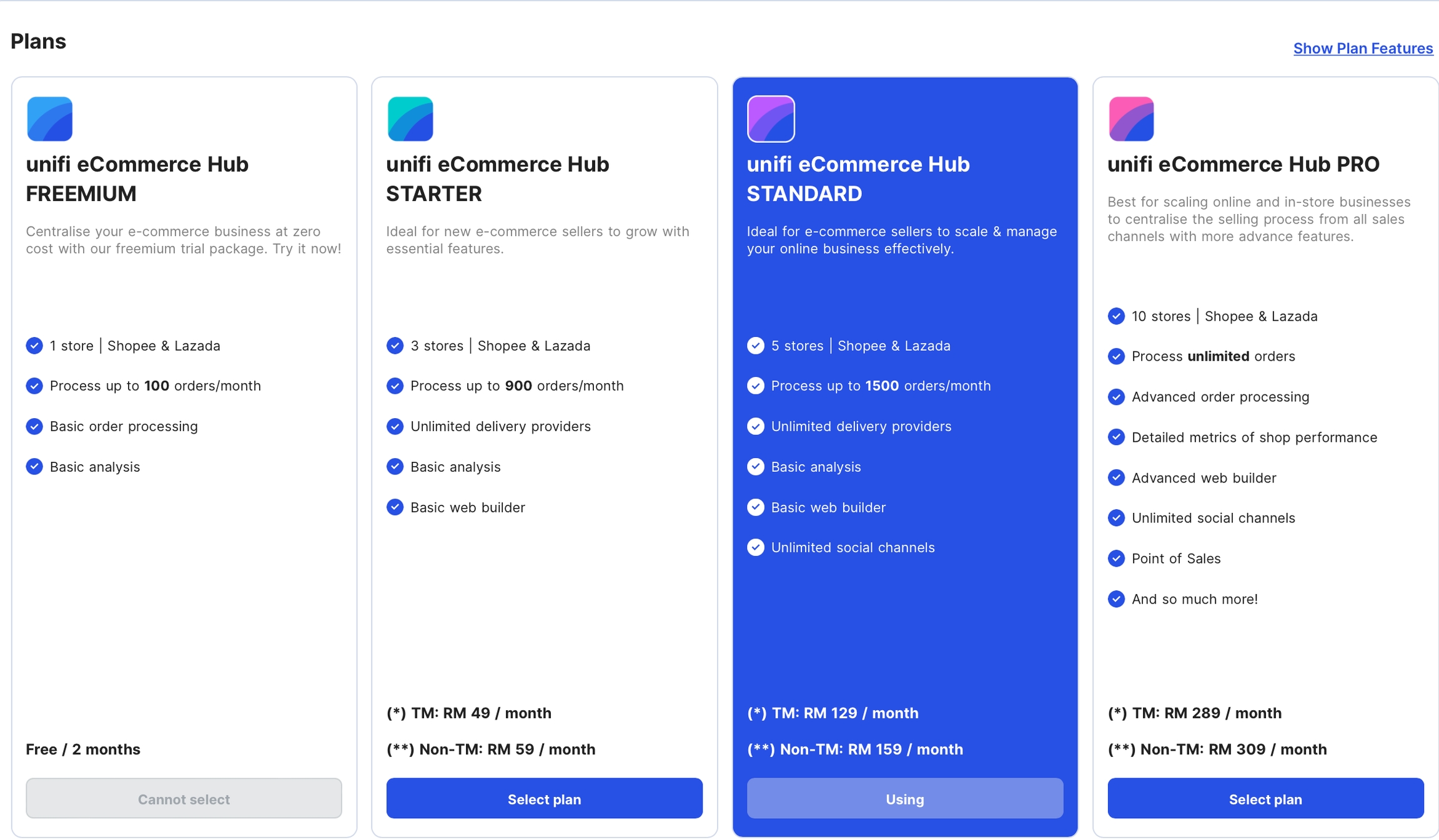 Sekiranya anda merancang untuk mengubahsuai pelan semasa anda tetapi tidak yakin untuk menukar kepada pelan yang lain, anda boleh menyemak perbandingan pelan dengan tekan pada butang Show plan features.