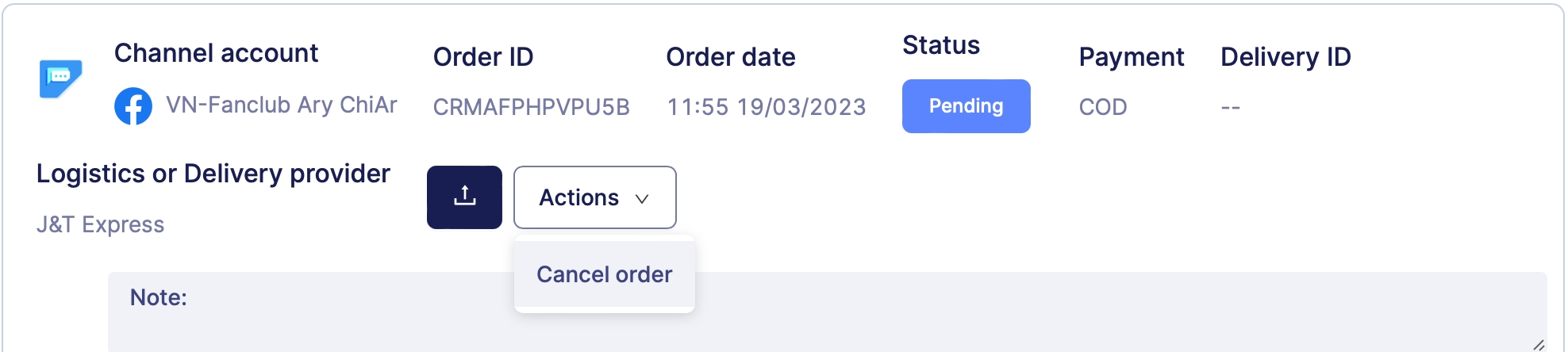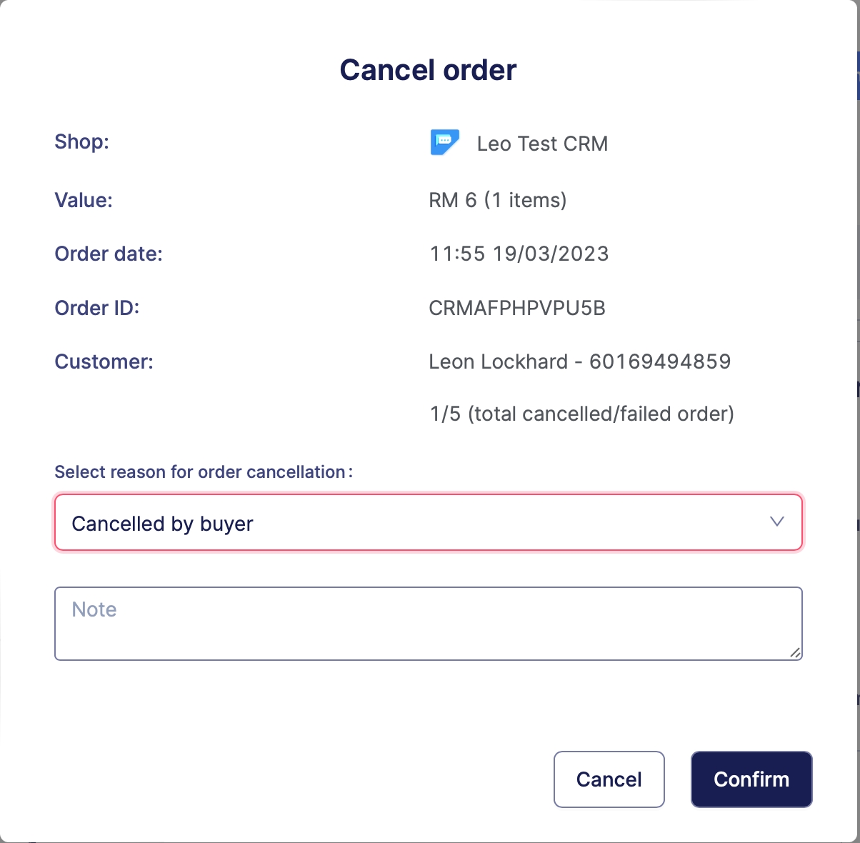 Anda boleh masukkan nota penjual (pilihan) dan tekan pada Confirm untuk membatalkan pesanan. Status pesanan akan berubah daripada Pending kepada Cancelled, maksudnya pesanan pelanggan ini telah berjaya dibatalkan oleh anda dan sebarang proses lanjut di sistem Centralised Distribution tidak akan dapat dilakukan.