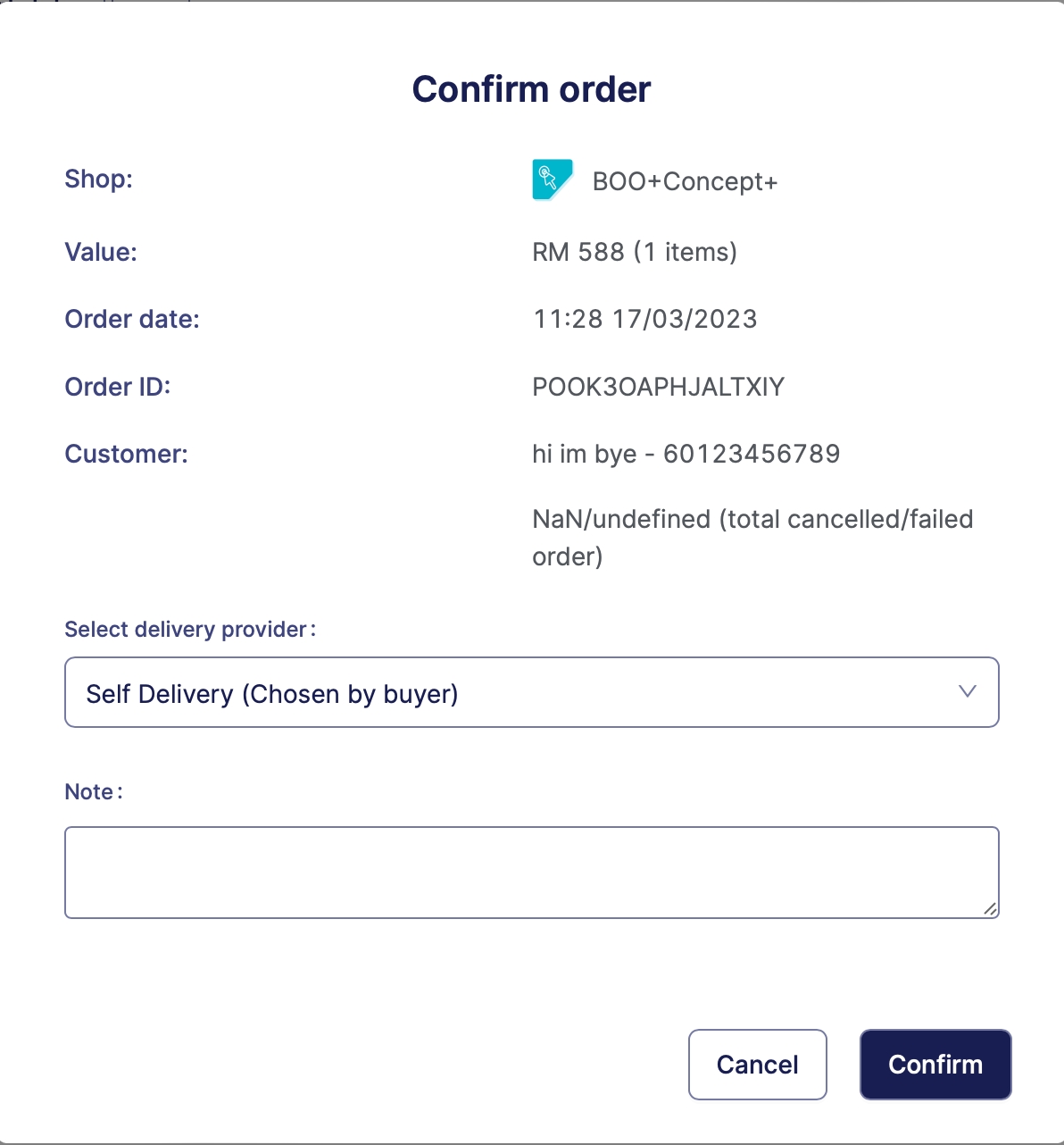 Anda boleh masukkan nota penjual (pilihan) dan tekan Confirm untuk memproses pesanan. Status pesanan akan berubah daripada Pending kepada Ready to Ship, bermaksud pesanan pelanggan telah berjaya disahkan dan sedia untuk dihantar.