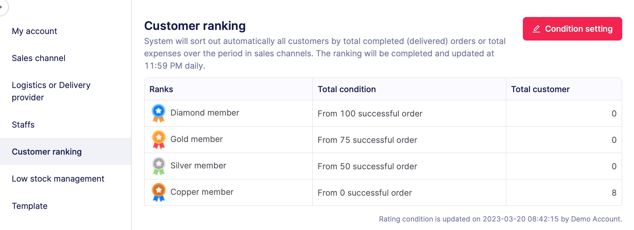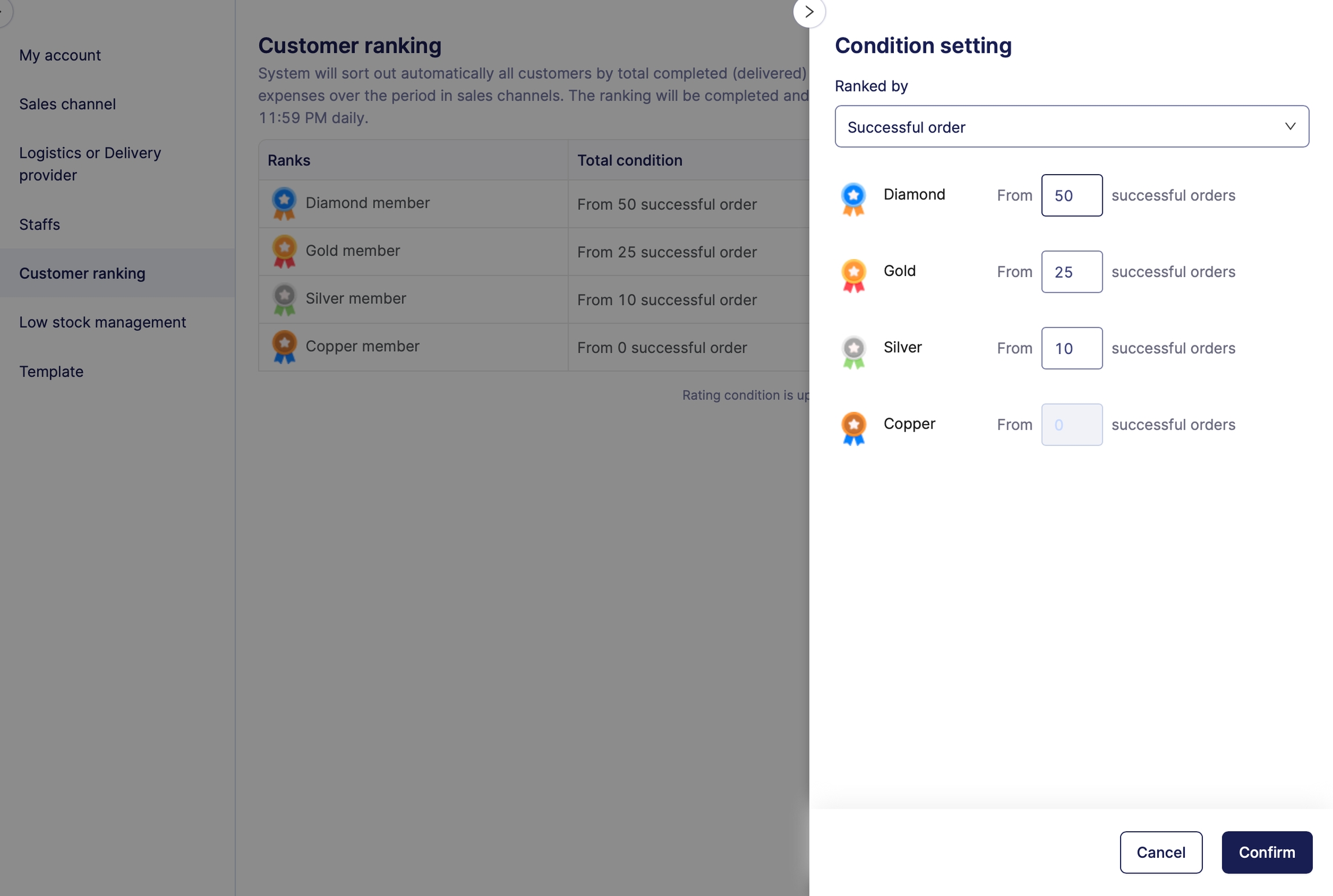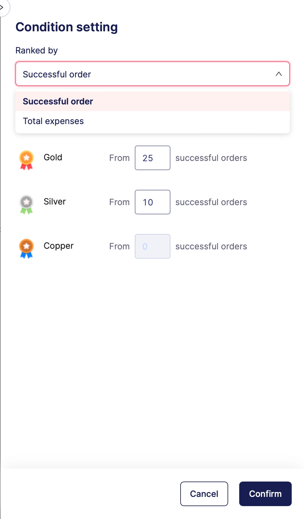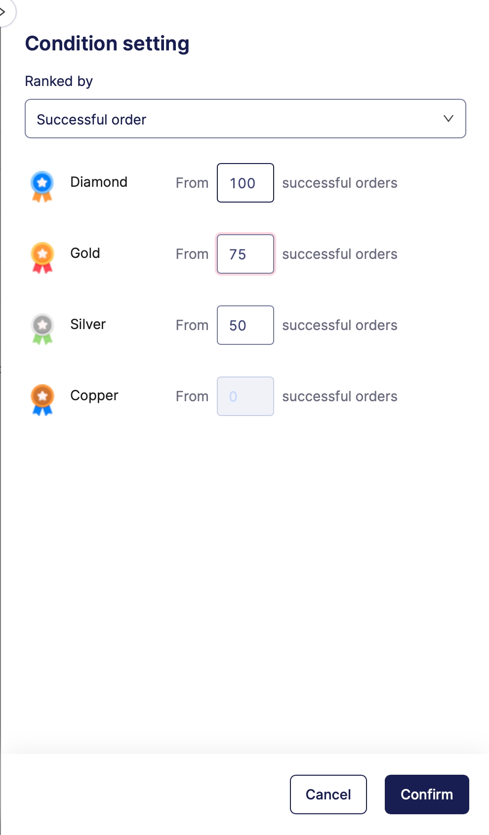 Anda boleh memasukkan nilai ambang bagi setiap kedudukan yang sepadan seperti Copper, Silver, Gold, dan Diamond. Sekiranya pelanggan memenuhi konfigurasi nilai ambang bagi kedudukan Silver, dia akan dikelaskan sebagai pelanggan tahap Silver.