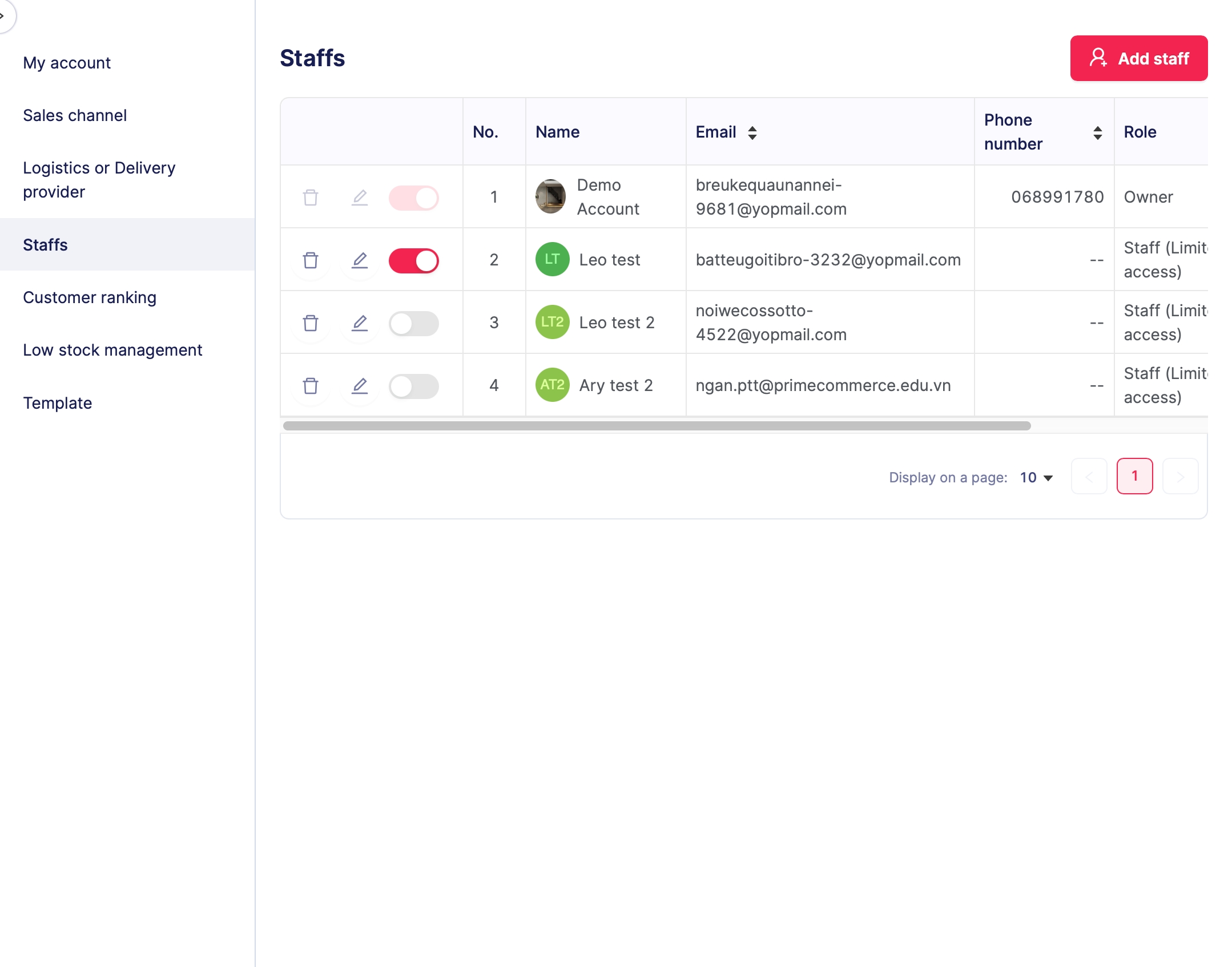 Anda boleh pergi ke Setting > Staffs untuk menyemak senarai kakitangan dan butiran informasi mereka.