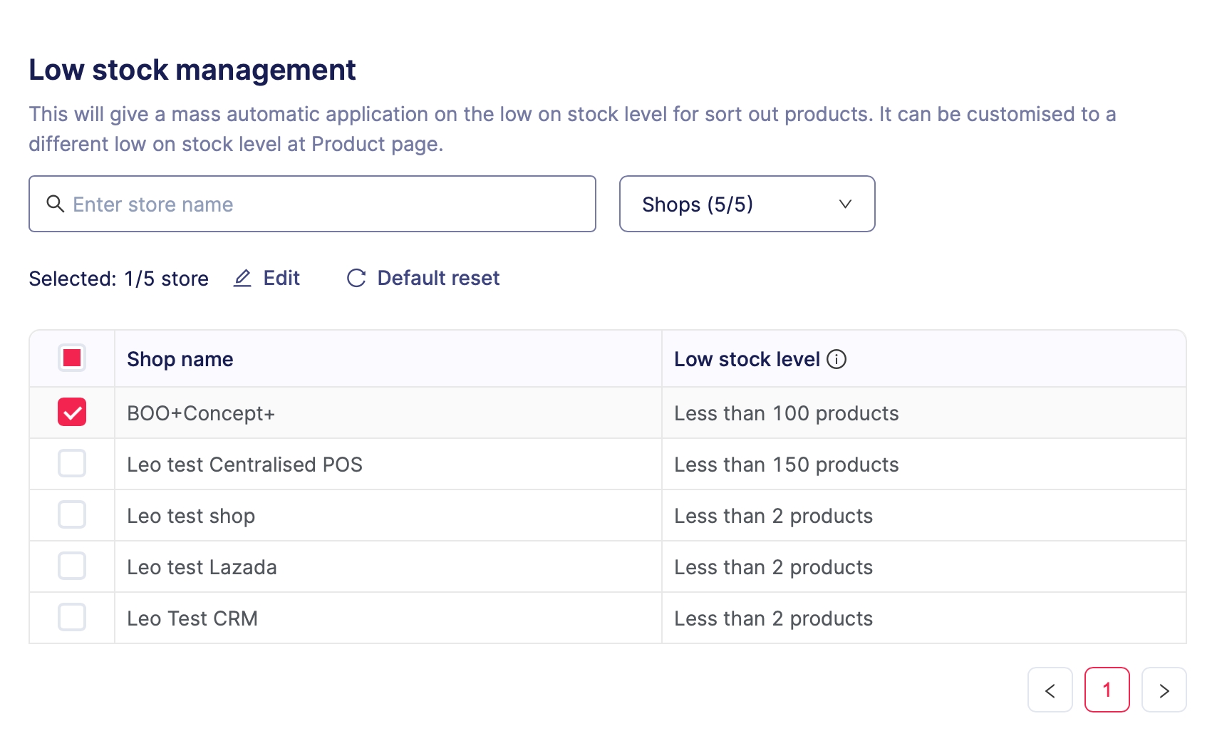 Tekan butang set semula Default dan sistem akan mengalih keluar nilai ambang dan tetapkan ianya kepada Don't have any rule settled. Tahap stok rendah telah dialih keluar daripada semua produk di saluran jualan.