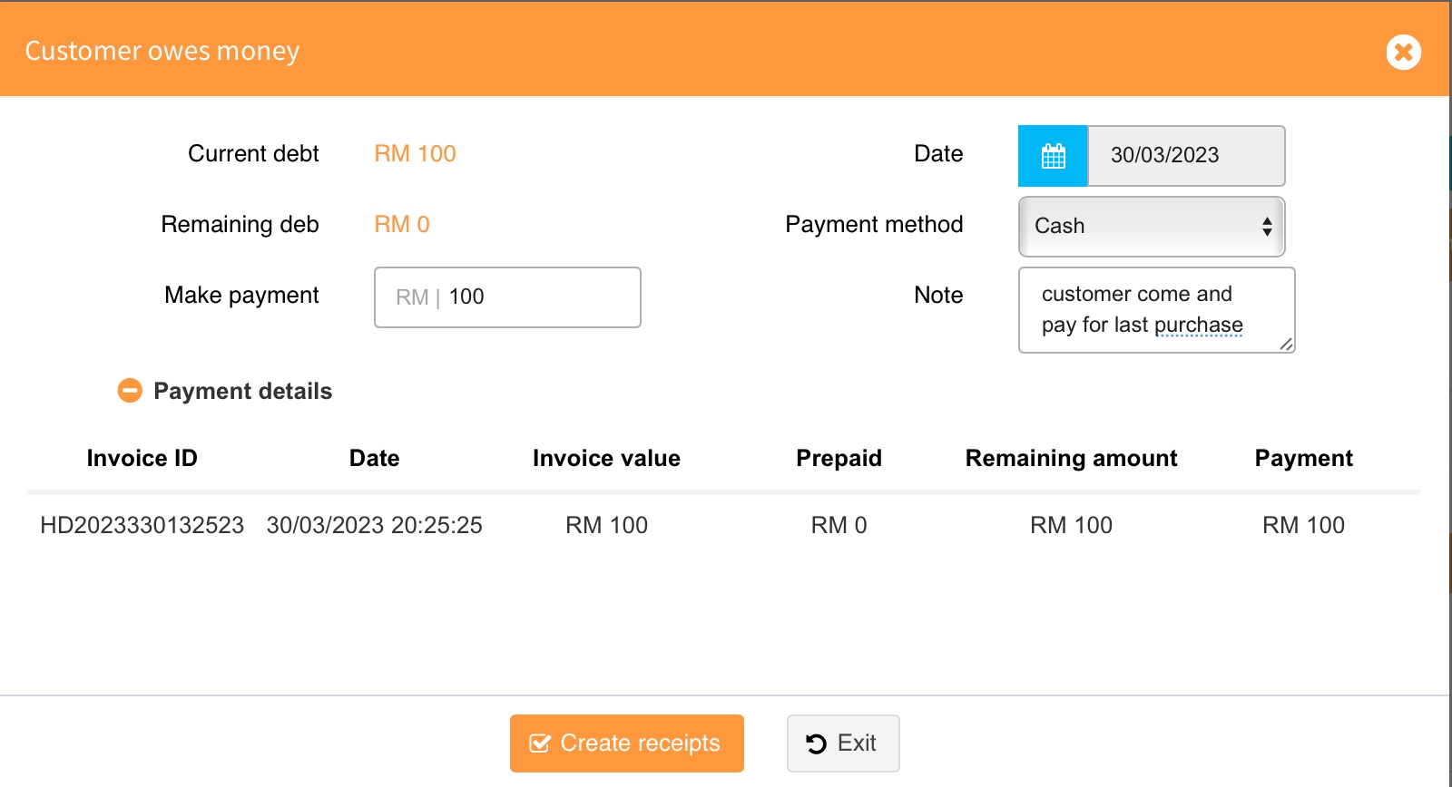 Masukkan nilai bayaran, nota dan tekan Create receipts.