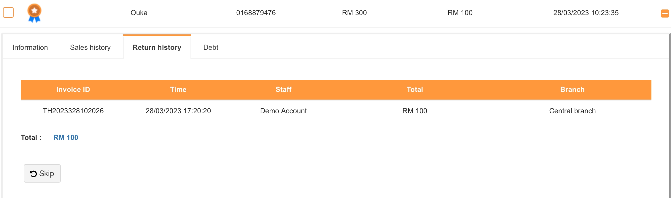 Bahagian sejarah pemulangan membolehkan anda melihat senarai semua pesanan yang dipulangkan oleh pelanggan tertentu:
