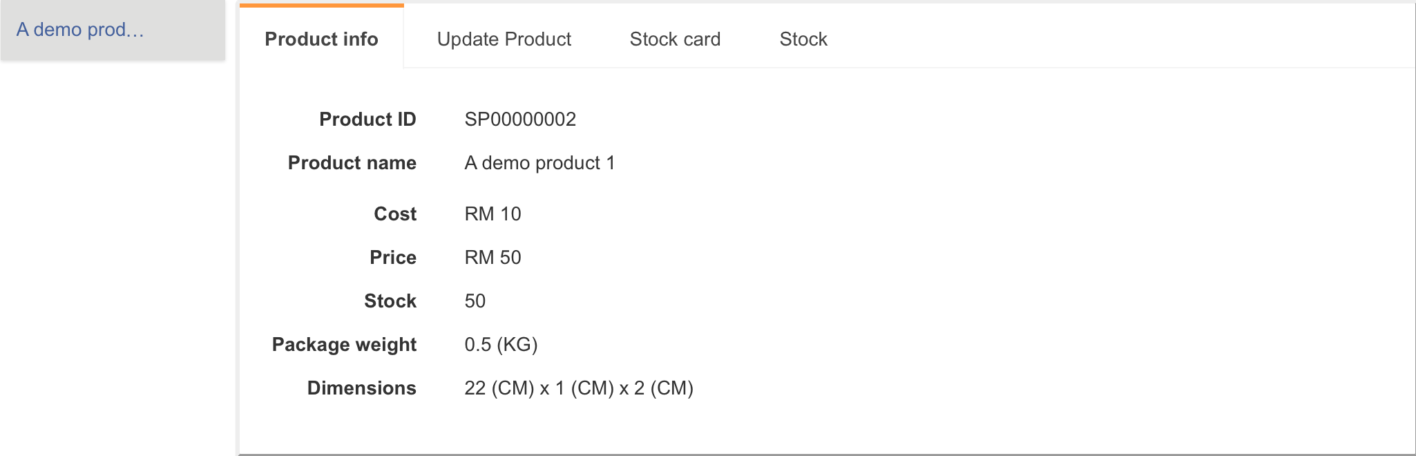 Apabila anda menekan pada produk dalam senarai produk untuk dilihat, sistem akan membenarkan anda untuk menavigasi di antara empat tab berikut: