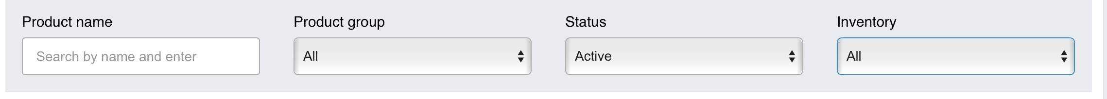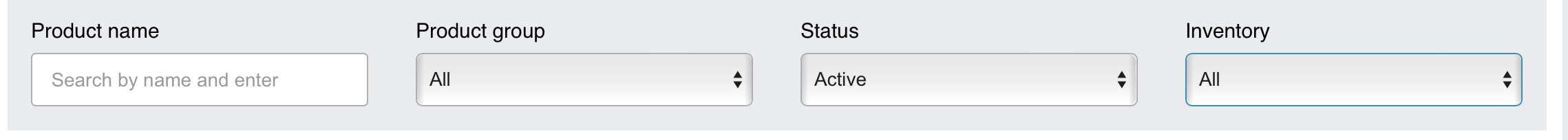 Menapis produk berdasarkan kumpulan produk, status ketersediaan, dan status inventori.