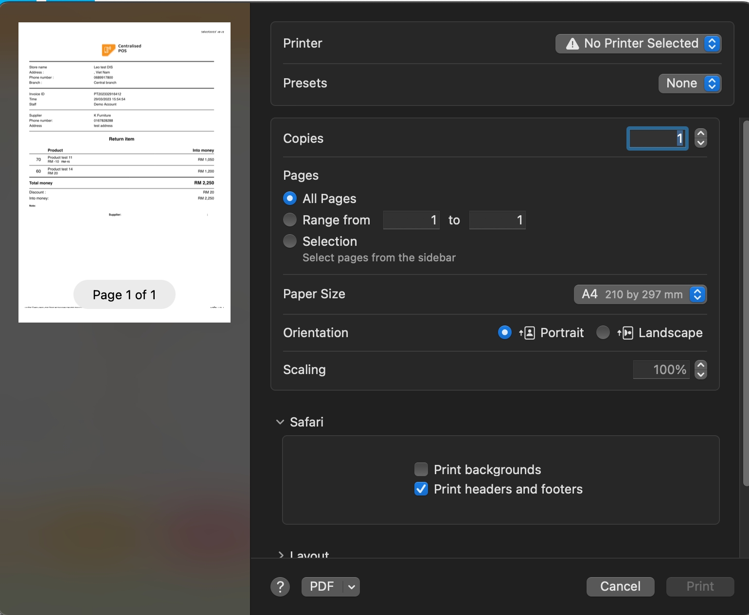 Anda boleh memulakan proses pencetakan dengan menekan butang Print invoice.