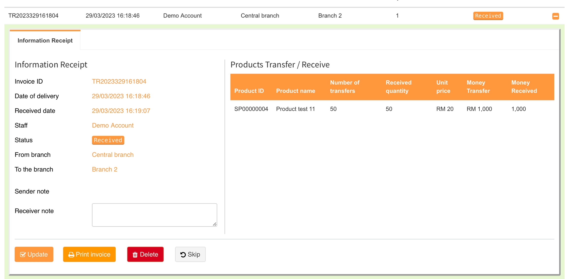 Tiket penghantaran dicipta apabila anda memerlukan rekod untuk memindahkan dan mengawal pemindahan produk dari satu cawangan ke cawangan lain.