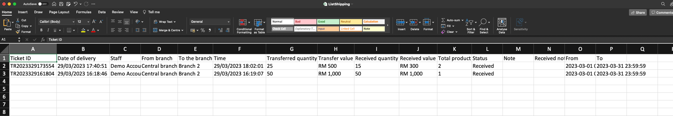 Eksport senarai tiket penghantaran ke .xlsx
