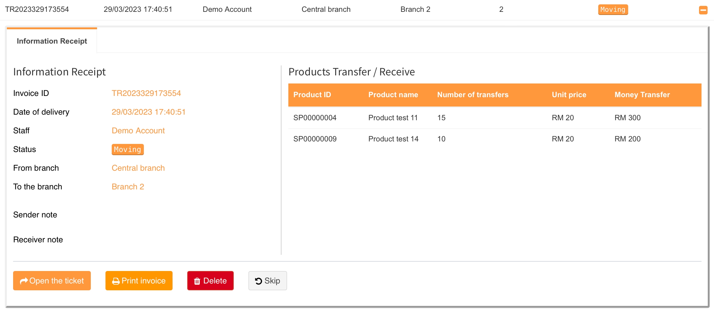 Selepas tiket penghantaran telah dicipta. Kakitangan di cawangan penerimaan (cawangan penerimaan) akan bertanggungjawab untuk menyelesaikan tiket penghantaran apabila produk tersebut dikirimkan dari cawangan asal. Ini akan membantu pemilik perniagaan untuk mempunyai kawalan penuh ke atas proses tersebut dan juga cara yang bermakna untuk mencatatkan produk yang boleh dipindahkan untuk kawalan stok.