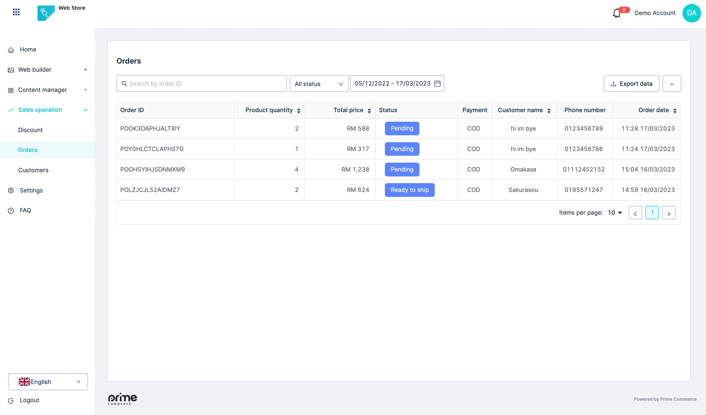 Anda boleh pergi ke Sales operation > Order untuk memaparkan senarai pesanan pelanggan dari laman sesawang.