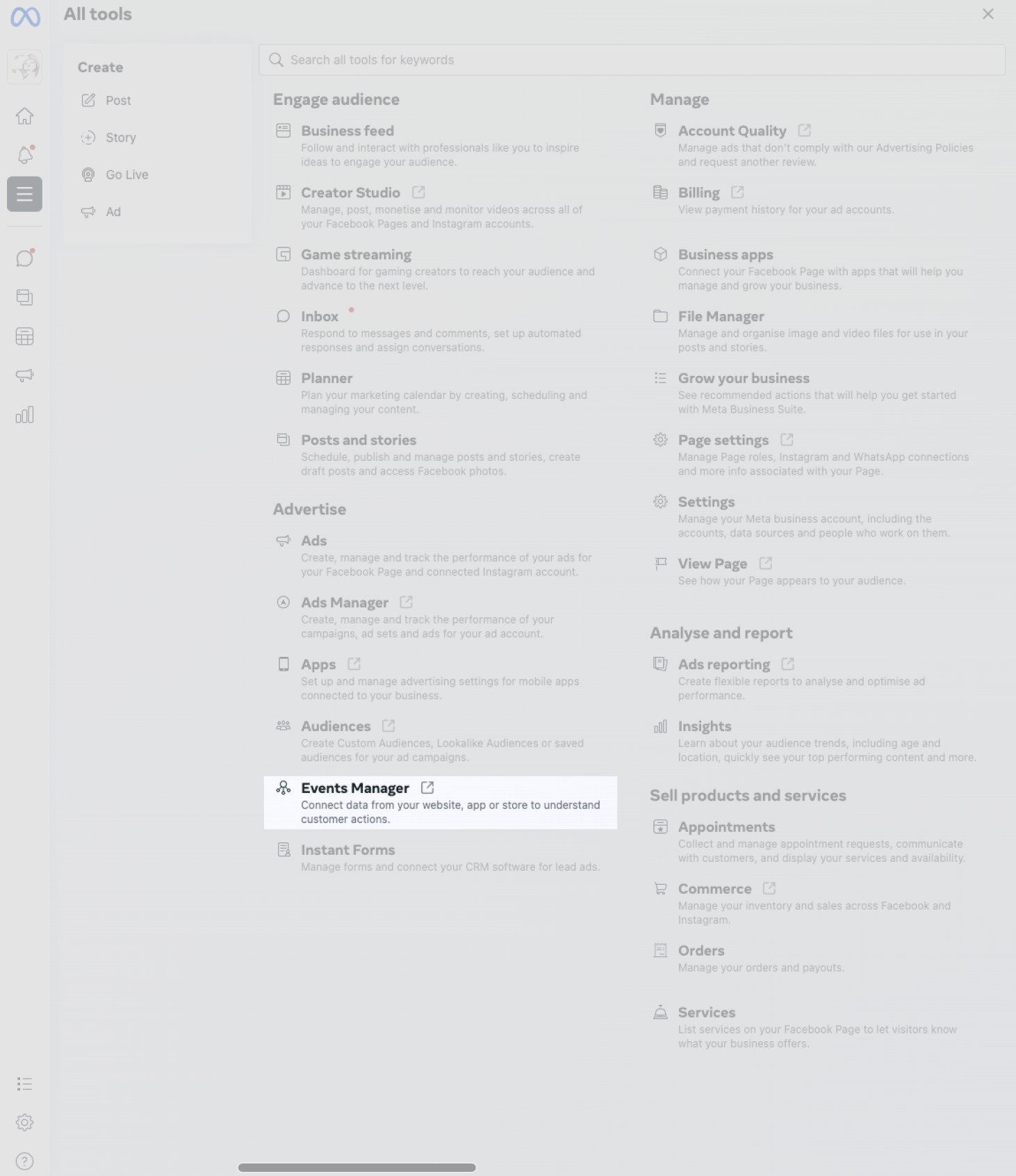 Langkah 1: Akses Facebook Page anda. Tekan Meta Business Suite dan anda akan diarahkan ke halaman yang membolehkan anda menyemak halaman All tool/Advertise/Event Manager.