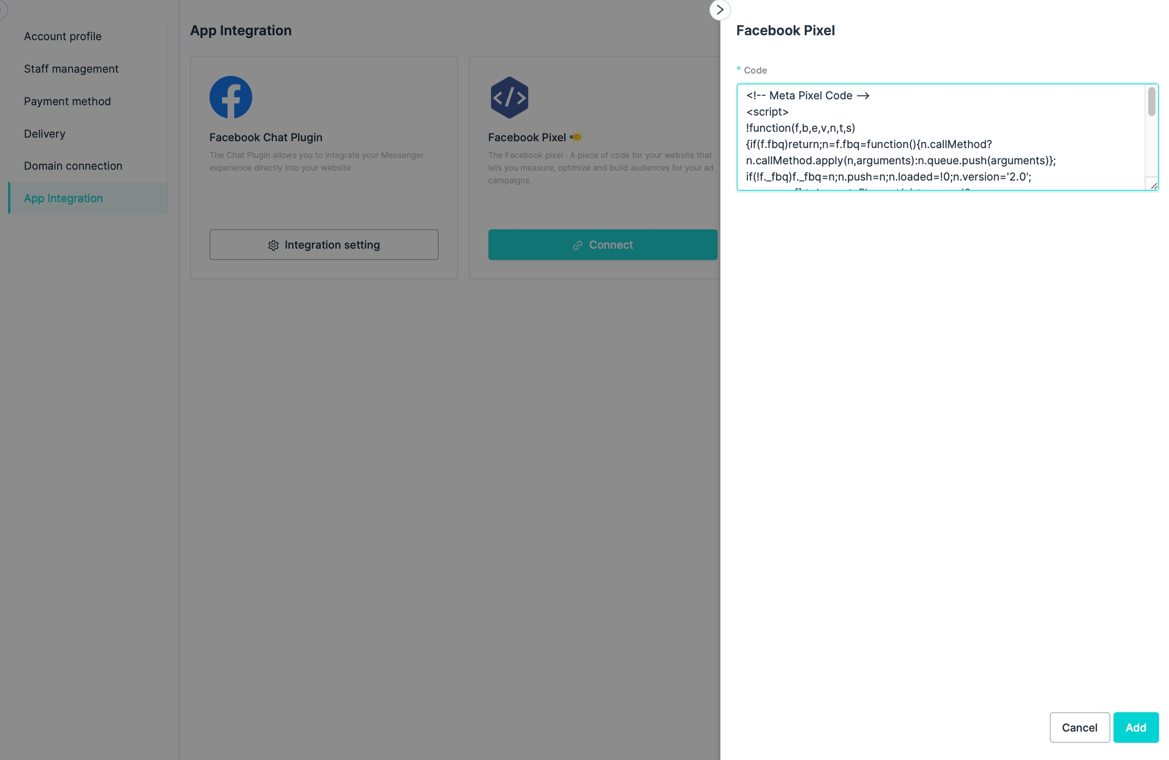 Langkah 7: Masukkan kod ke bahagian Facebook Pixel di MesraWeb dan tekan Add.